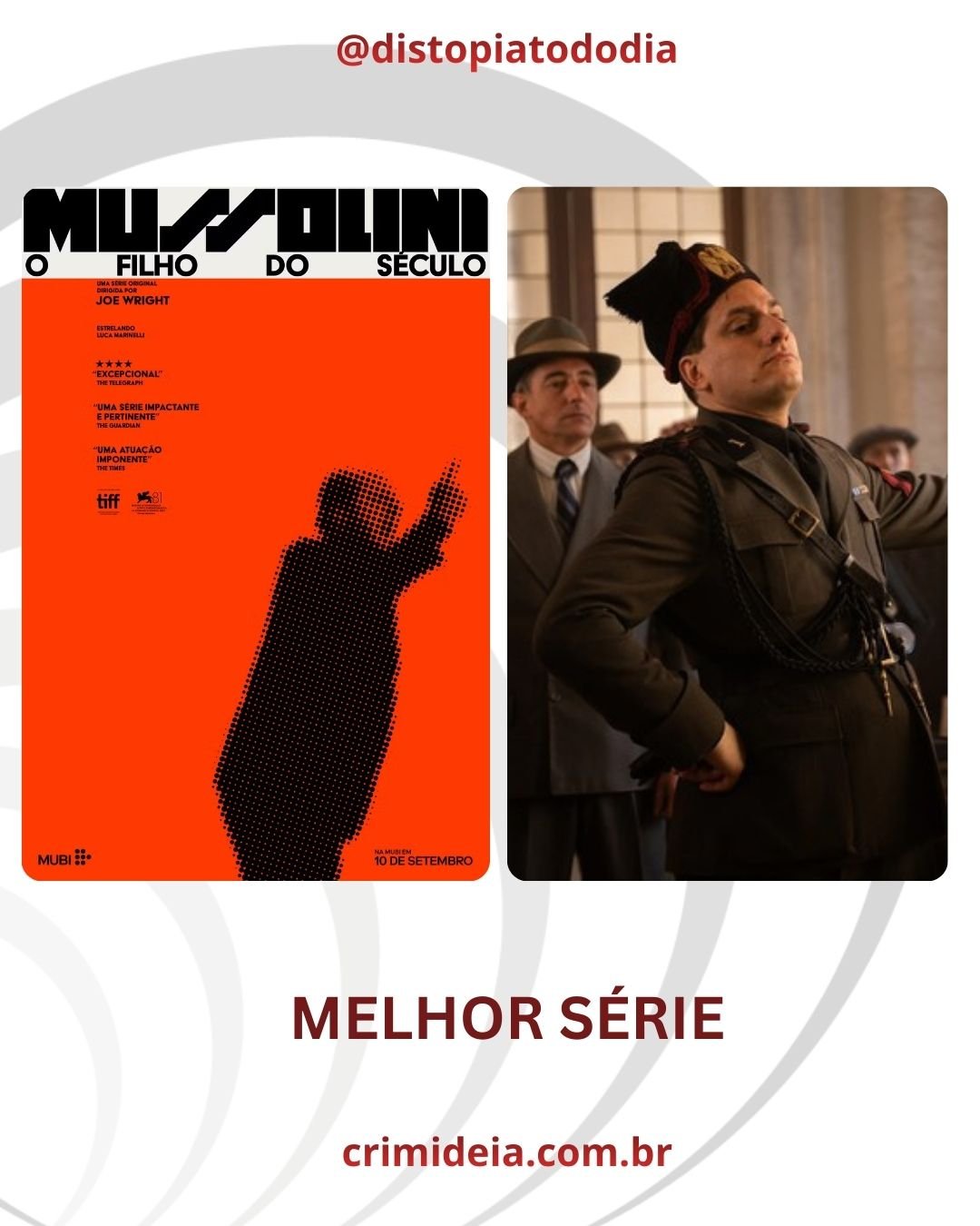 Luca Marinelli em uma atuação absurda ao encarnar os primeiros anos de Mussolini e a construção do fascismo na Itália, baseado no livro de Scurati. Direção primorosa de Joe Wright e trilha bate-estaca do Chemical Brothers. Série boa demais e ácida demais para ser renovada.